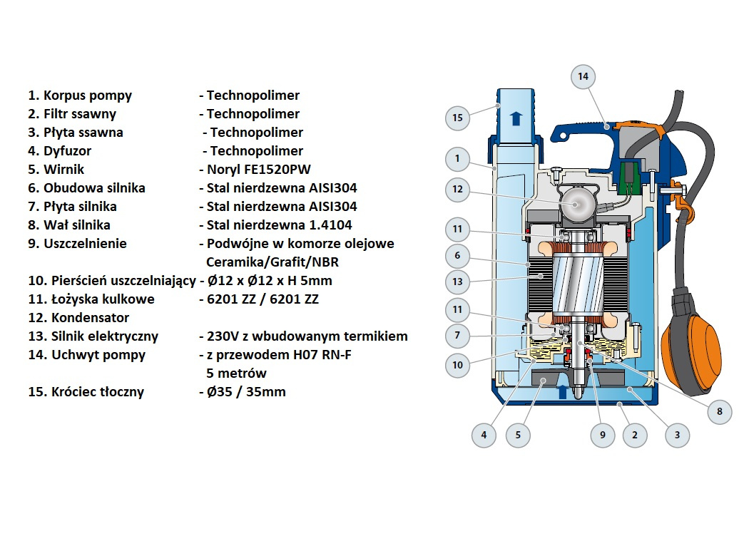 Podstawowe komponenty pomp zatapialnych Pedrollo TOP wykonane zostały z najtrwalszych, odpornych na korozję materiałów takich jak: