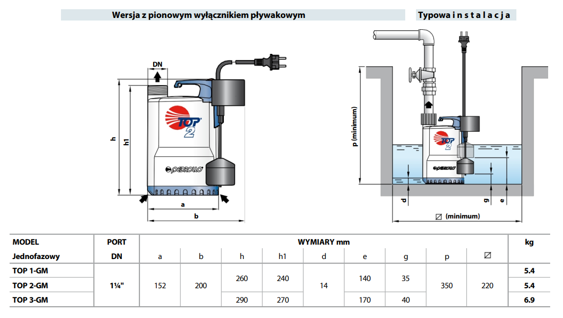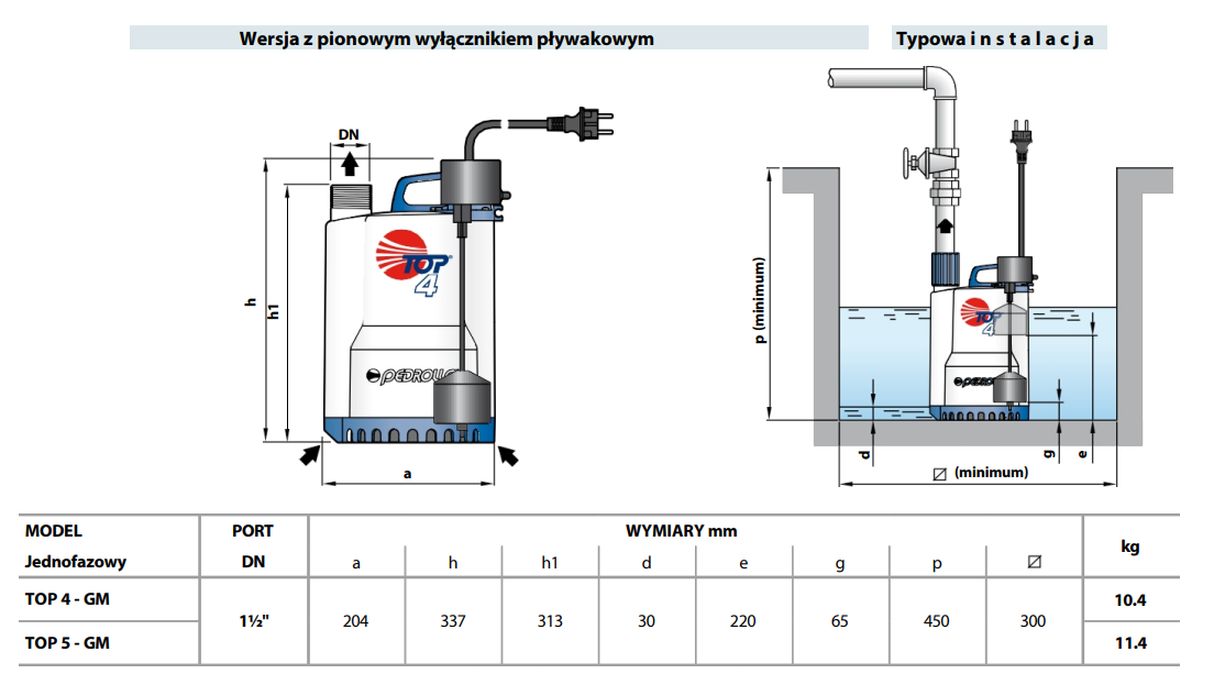 Pompy zatapialne Pedrollo serii TOP GM to funkcjonalne pompy o niewielkiej wadze i wymiarach. Stosunkowo niska cena oraz satysfakcjonujące parametry sprawiają, że są one bardzo atrakcyjne dla użytkowników, którzy korzystają z pomp zatapialnych jedynie w sytuacjach awaryjnych. Pompy TOP GM wykorzystywane są głównie do użytku domowego, np. do opróżniania zalanych pomieszczeń, piwnic, wypompowywania wody z basenów, czy usuwania ścieków z pralek czy zmywarek w nagłych sytuacjach. Przeznaczone są do pompowania czystej i lekko brudnej cieczy, z obecnością miękkich ciał stałych o maksymalnej wielkości do 10mm. Pompowana ciecz nie może posiadać ciał stałych szlifujących oraz długowłóknistych. Maksymalna temperatura tłoczonych substancji powinna wynosić nieco ponad 40°C, jednak w sporadycznych przypadkach, maksymalnie przez trzy minuty, pompa może tłoczyć ciecz o temperaturze nawet 90°C. Pompy zatapialne Pedrollo TOP GM przystosowane są do pracy ciągłej, a także wyposażone są w magnetyczny, pionowy wyłącznik pływakowy, który steruje pracą urządzenia, w zależności od poziomu pompowanej wody, a także umożliwia instalacje urządzeń w bardzo wąskich studzienkach.