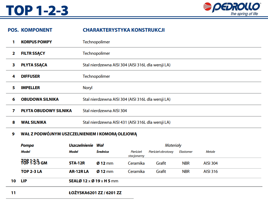 Podstawowe komponenty pomp zatapialnych Pedrollo TOP GM wykonane zostały z najtrwalszych, odpornych na korozję materiałów takich jak: