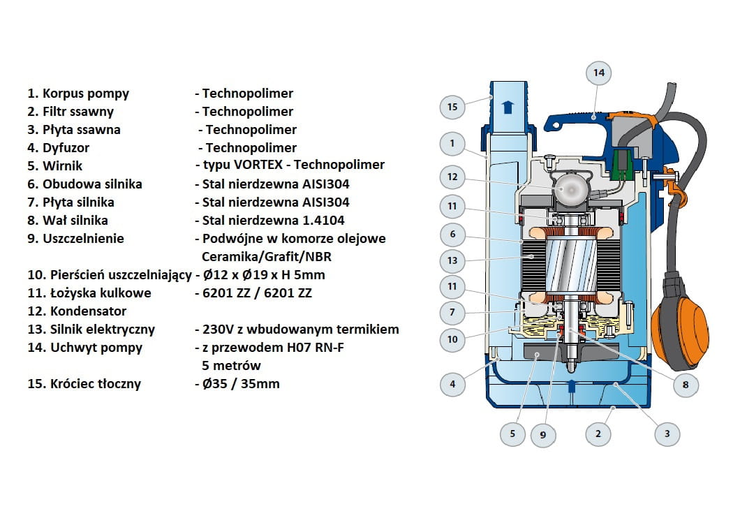 - wirnik VORTEX umożliwiający pompowanie wody z obecnością większych zanieczyszczeń